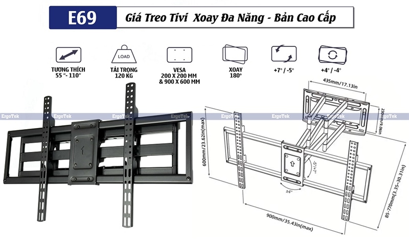 Khung treo tivi cỡ lớn 55-110 inch ErgoTek E69/P900 xoay đa năng nhập khẩu chính hãng – Cái