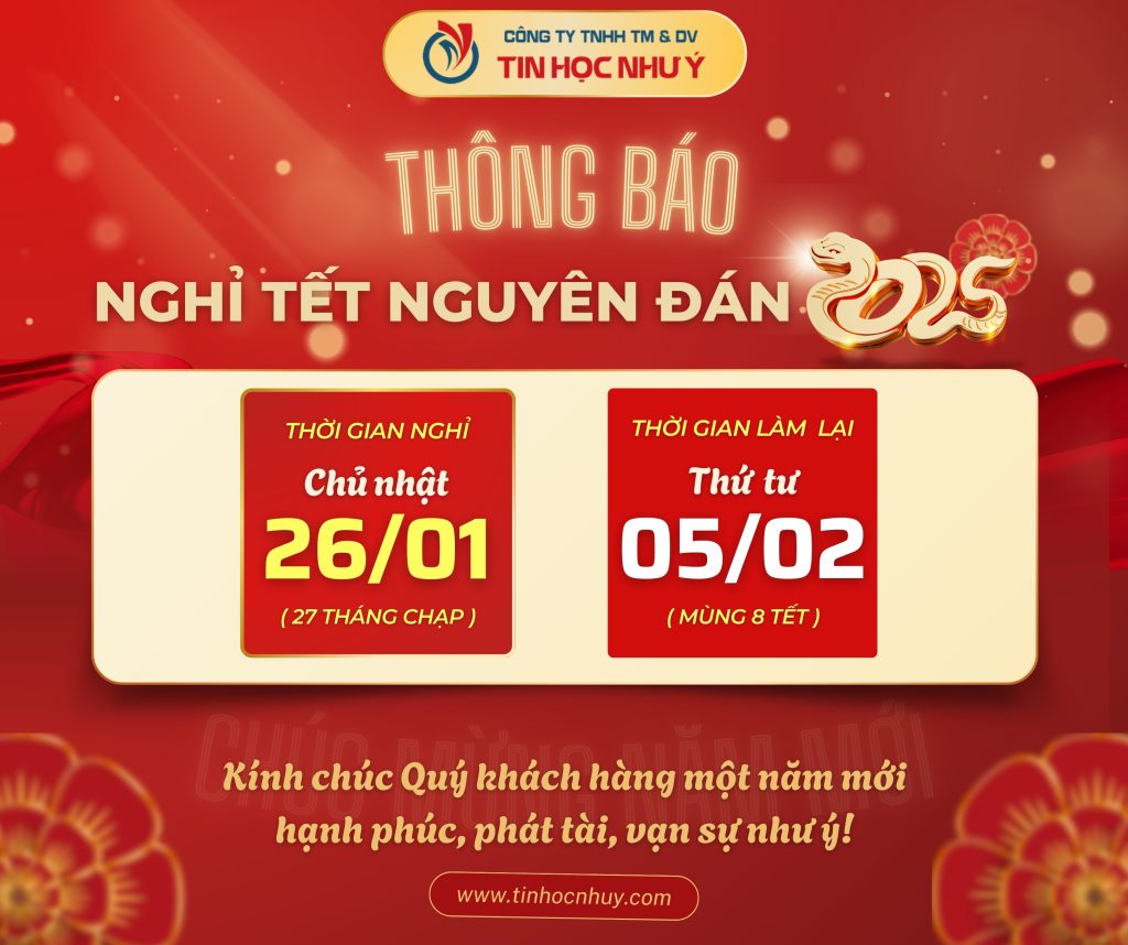 Công ty TNHH TM&DV Tin Học Như Ý xin trân trọng thông báo đến toàn thể Quý đối tác, Quý khách hàng lịch nghỉ Tết Nguyên Đán Ất Tỵ 2025 như sau: